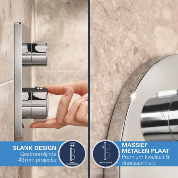 Met Grohe TurboStat behoort het probleem van temperatuurschommelingen tot het verleden, zodat je elke douchebeurt kunt genieten van een stabiele watertemperatuur. De set is gezinsvriendelijk door de Grohe SafeStop temperatuurbegrenzer, die standaard is ingesteld op 38°C om verbranding te voorkomen. Voor extra veiligheid kun je de optionele SafeStop Plus gebruiken, die de temperatuur verder beperkt tot 43°C.