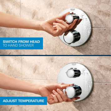 De Grohe SafeStop knop, ingesteld op 38°C, beschermt je tegen verbranding, wat zorgt voor een veilige doucheervaring, zelfs voor kleine kinderen. Voor extra veiligheid kun je de optionele Grohe SafeStop Plus instellen om het temperatuurmaximum verder te beperken tot 43°C of 46°C. Het systeem biedt ook de handige Grohe AquaDimmer, waarmee je eenvoudig schakelt tussen de hand- en hoofddouche en het watervolume naar wens aanpast. De royale hoofddouche biedt een rustgevende Grohe PureRain Spray, terwijl de handdouche voorzien is van een veelzijdige Normal Spray. Beide douches worden compleet geleverd met een houder, wandaansluitbocht en een TwistStop doucheslang.