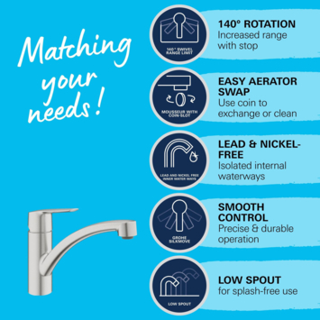 Met de GROHE Start eengreeps keukenkraan breng je je keuken snel en eenvoudig up-to-date dankzij het nieuwe montagesysteem. Deze designklassieker is opgefrist om te voldoen aan de eisen van moderne keukens en heeft nu een slank, modern profiel en beschikt over meer gebruikscomfort. Deze keukenkraan is ontworpen voor eengatsinstallatie en de lage uitloop kan soepel 150° worden gedraaid, wat meer flexibiliteit biedt aan de spoelbak zonder dat je op de muren spettert. De mousseur kan eenvoudig worden verwisseld met behulp van slechts een muntje – er komt dus geen gereedschap aan te pas. Binnenin zorgt de technologie van het GROHE SilkMove ES-cartouche voor een levenslange soepele en nauwkeurige bediening terwijl GROHE Zero geïsoleerde binnenwaterwegen zorgt ervoor dat je drinkwater lood- en nikkelvrij is. Een instelbare debietbegrenzer bespaart water en geld terwijl een geïntegreerde temperatuurbegrenzer verbranding voorkomt. De matte, slijtvaste GROHE StarLight-coating maakt gebruik van Physical Vapour Deposition (PVD) waardoor het tien keer meer krasbestendigheid heeft dan gewoon chroom. Met de GROHE QuickFix Plus-set kan de keukenkraan eenvoudig en snel worden geïnstalleerd, zonder dat je gereedschap nodig hebt. Voor deze kraan wordt een minimale druk van 1,0 bar aanbevolen.