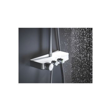 Het GROHE Euphoria SmartControl 260 douchesysteem haalt het meeste uit je douchebeurt en maakt hier een verkwikkend moment van dankzij een reeks stralingsopties en slimme functies. Met de innovatieve GROHE SmartControl- technologie kan je tussen de hoofd- en handdouche kiezen en deze afwisselen. Hiermee kan je ook wisselen tussen of zelfs de verschillende sproeipatronen op de hoofddouche combineren en het waterdebiet via de draaiknop regelen. Waterbesparing is eenvoudiger dan ooit – je schakelt het debiet van volle stroom naar EcoJoy. De 260 mm draaibare hoofddouche heeft drie sproeipatronen: de krachtige en geconcentreerde Jet Spray, de SmartRain Spray die zorgt dat je helemaal ontspant en de Rain Spray die zorgt dat alle sproeigaatjes van de hoofddouche worden gebruikt om een allesomvattend gevoel te creëren. Kies simpelweg welke van de drie je wil gebruiken met een draai aan de knop in het midden van de sproeikop. De 110 mm handdouche biedt drie sproeiopties – de ontspannende Rain, de milieuvriendelijke SmartRain en de stimulerende Massage Spray. GROHE DreamSpray- technologie zorgt ervoor dat elk sproeigaatje van de kop een gelijke stroom biedt bij alle sproeiopties. Het reinigen van de SpeedClean- siliconen sproeigaatjes is moeiteloos – je veegt de kalkaanslag er moeiteloos vanaf. Dankzij GROHE TurboStat geniet je van een constante watertemperatuur tijdens het douchen. Met GROHE SafeStop kan je een maximumtemperatuur van 38°C instellen, terwijl SafeStop Plus een optionele limiet van 43°C biedt. Voor extra veiligheid zorgt GROHE CoolTouch ervoor dat de blootgestelde thermostaat nooit te heet zal zijn om aan te raken. Voor extra comfort is er een EasyReach- bak zodat je jouw toiletartikelen altijd bij de hand hebt. De duurzame maar schitterende GROHE StarLight chromen afwerking zorgt ervoor dat de hele set er prachtig uitziet. En GROHE QuickFix maakt de installatie snel en gemakkelijk: de bovenste beugel kan worden afgesteld om bestaande boorgaten te hergebruiken.