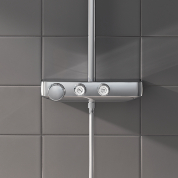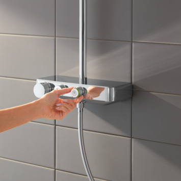Het GROHE Euphoria SmartControl 260 douchesysteem haalt het meeste uit je douchebeurt en maakt hier een verkwikkend moment van dankzij een reeks stralingsopties en slimme functies. Met de innovatieve GROHE SmartControl- technologie kan je tussen de hoofd- en handdouche kiezen en deze afwisselen. Hiermee kan je ook wisselen tussen of zelfs de verschillende sproeipatronen op de hoofddouche combineren en het waterdebiet via de draaiknop regelen. Waterbesparing is eenvoudiger dan ooit – je schakelt het debiet van volle stroom naar EcoJoy. De 260 mm draaibare hoofddouche heeft drie sproeipatronen: de krachtige en geconcentreerde Jet Spray, de SmartRain Spray die zorgt dat je helemaal ontspant en de Rain Spray die zorgt dat alle sproeigaatjes van de hoofddouche worden gebruikt om een allesomvattend gevoel te creëren. Kies simpelweg welke van de drie je wil gebruiken met een draai aan de knop in het midden van de sproeikop. De 110 mm handdouche biedt drie sproeiopties – de ontspannende Rain, de milieuvriendelijke SmartRain en de stimulerende Massage Spray. GROHE DreamSpray- technologie zorgt ervoor dat elk sproeigaatje van de kop een gelijke stroom biedt bij alle sproeiopties. Het reinigen van de SpeedClean- siliconen sproeigaatjes is moeiteloos – je veegt de kalkaanslag er moeiteloos vanaf. Dankzij GROHE TurboStat geniet je van een constante watertemperatuur tijdens het douchen. Met GROHE SafeStop kan je een maximumtemperatuur van 38°C instellen, terwijl SafeStop Plus een optionele limiet van 43°C biedt. Voor extra veiligheid zorgt GROHE CoolTouch ervoor dat de blootgestelde thermostaat nooit te heet zal zijn om aan te raken. Voor extra comfort is er een EasyReach- bak zodat je jouw toiletartikelen altijd bij de hand hebt. De duurzame maar schitterende GROHE StarLight chromen afwerking zorgt ervoor dat de hele set er prachtig uitziet. En GROHE QuickFix maakt de installatie snel en gemakkelijk: de bovenste beugel kan worden afgesteld om bestaande boorgaten te hergebruiken.