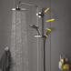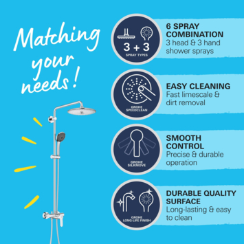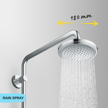 De hoofddouche met de Rain straal kun je lichtjes draaien over het kogelgewricht. Bij de handdouche verstel je straalstand van een Rain straal, als van een zachte zomerbui, naar de SmartRain straal. Met deze straal verbruik je minder water en geniet je toch van het verkwikkende effect van een regenbui. De stevige Massage straal is intens en ontspannend. Welke straal je ook wenst, je kiest het gemakkelijk met de traploze GROHE Spraydimmer.