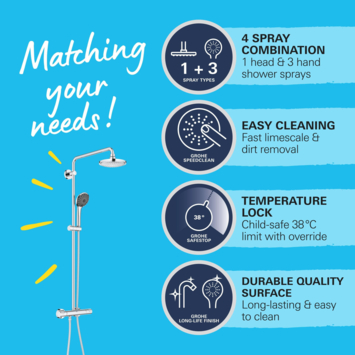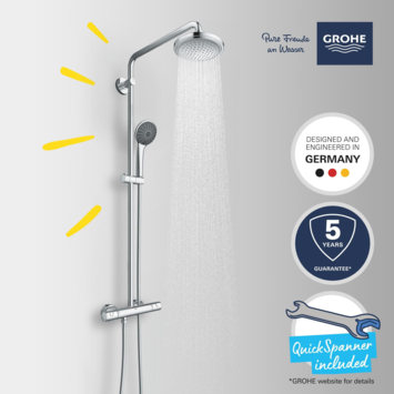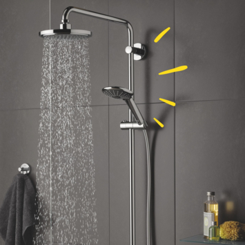 Met deze set kun je genieten van extra mogelijkheden en comfort tijdens jouw douche. Dankzij de GROHE TurboStat® technologie in de thermostaatkraan is het douchewater direct en continu op de gewenste temperatuur. Ook aan de veiligheid is gedacht; SafeStop zorgt ervoor dat de watertemperatuur nooit ongewild hoger is dan 38 °C. En dat is veilig voor heel het gezin.