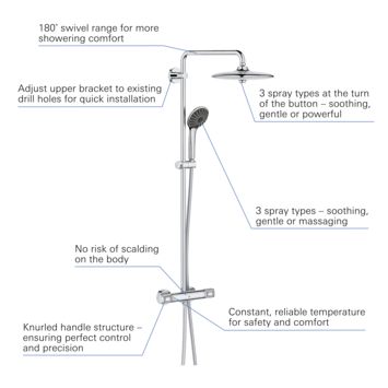 De thermostaatkraan zorgt voor een constante en comfortabele watertemperatuur, wat bijdraagt aan een veilige en aangename douche-ervaring. De anti-kalk functie houdt de set vrij van kalkaanslag, waardoor je minder tijd hoeft te besteden aan onderhoud. Bovendien helpt de waterbesparende technologie je om water te besparen zonder in te boeten op douchecomfort.