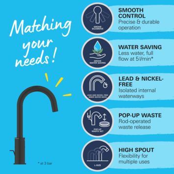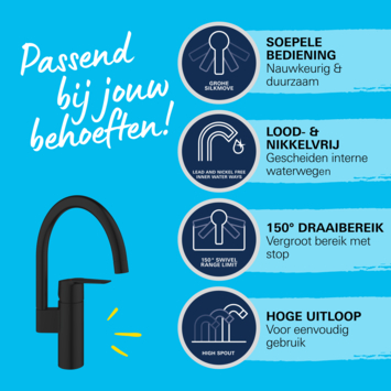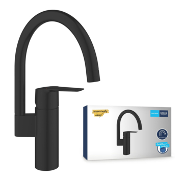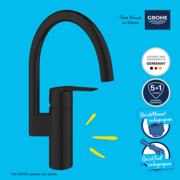 De robuuste GROHE Long-Life afwerking in mat zwart is krasbestendig en eenvoudig te reinigen, zodat je keuken er altijd mooi uit blijft zien. Dankzij het gereedschapsvrije GROHE QuickMount systeem, en met de QuickGuide en QuickVideo, kun je de kraan snel zelf installeren. Voor een optimale werking is een minimumdruk van 0,2 bar aanbevolen.