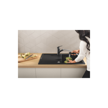 De GROHE Start keukenkraan lage uitloop mat zwart heeft een vernieuwd design en sluit nog beter aan bij een modern keukenontwerp. Uitgevoerd in een minimalistische stijl in de kleur in Matte Black (mat zwart) past deze blikvanger perfect in een industrieel interieur. De lage uitloop draait soepel 140° zodat je geniet van optimale flexibiliteit bij de spoelbak zonder dat je tegen een muur of keukenkastje aan stoot. De GROHE SilkMove cartouche garandeert een vloeiende bediening van de eengreeps hendel gedurende de hele levensduur van de kraan. Via de instelbare debietbegrenzer ga je milieubewust om met je waterverbruik, en de ingebouwde temperatuurbegrenzer voegt daar nog een energiebesparende functie aan toe. Het water uit deze keukenkraan is heerlijk van smaak; GROHE Zero voorkomt namelijk dat het water in de kraan in contact komt met lood en nikkel. Het vervangen of schoonmaken van de mousseur is heel gemakkelijk, want je draait deze in een mum van tijd los met een muntje. De duurzame GROHE Long-Life Finish beschermt de mat zwarte afwerking tegen krasjes en maak je met een droge doek makkelijk schoon. Deze keukenkraan heb je met behulp van de QuickGuide en QuickVideo (via QR-code) en het GROHE QuickMount-montagesysteem zonder gereedschap in een mum van tijd gemonteerd.