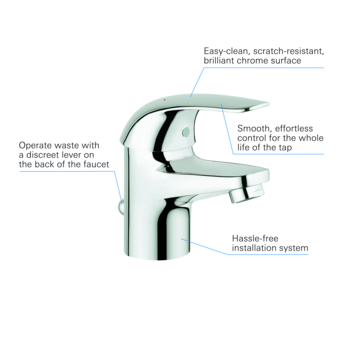 De GROHE Swift S-size éénhendel wastafelkraan met waste Chroom is een kleine kraan met een tijdloos en eenvoudig ontwerp.