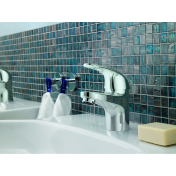 De kleine wastafelkraan is slechts 13,1 cm hoog wat ideaal is bij kleine badkamerruimtes of bij laaghangende kastjes.