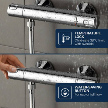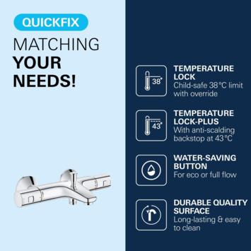 Het Grohe Turbostat element zorgt niet alleen voor extra comfort. Door het sneller bereiken van de gewenste temperatuur wordt er minder water verspilt. Met de waterbesparingsknop wordt de toevoer van water handmatig begrenst. Als je de watertoevoer wilt vergroten druk je eenvoudig de knop in en draait de kraan verder open.
