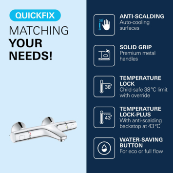 Het Grohe Turbostat element zorgt niet alleen voor extra comfort. Door het sneller bereiken van de gewenste temperatuur wordt er minder water verspilt. Met de waterbesparingsknop wordt de toevoer van water handmatig begrenst. Als je de watertoevoer wilt vergroten druk je eenvoudig de knop in en draait de kraan verder open.
