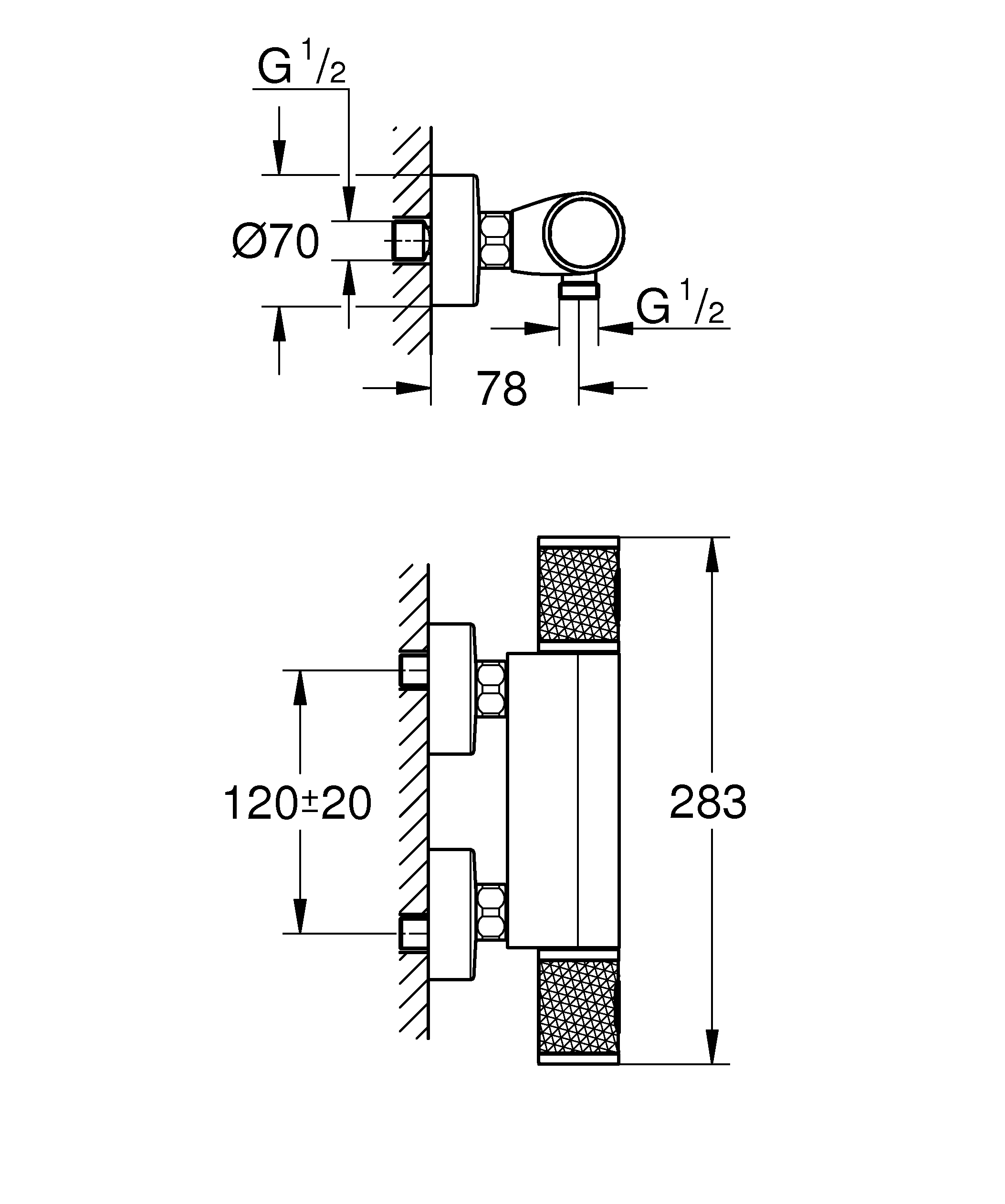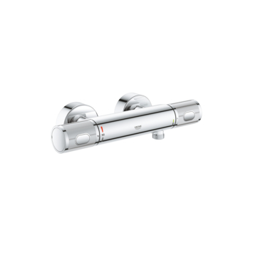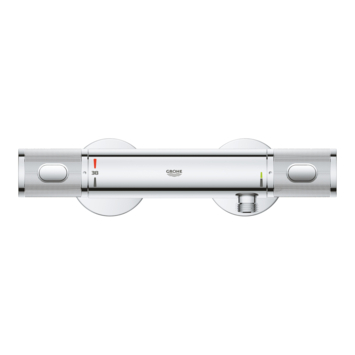 De Grohe Thermostatische Douchekraan Precision Trend New Chroom 12 cm is geschikt voor badkamers waar de hart-op-hart afstand tussen de koud- en warmwaterleiding 120 mm is. Deze thermostatische douchekraan zorgt voor een heerlijke douche met een constante watertemperatuur, ook al zijn er fluctuaties in de waterdruk. De kraan is voorzien van GROHE TurboStat: hiermee wordt snel en continu de gewenste temperatuur bereikt. De kraan beschikt over GROHE CoolTouch®, waardoor het binnenkomende hete water wordt omspoeld door koud water en de buitenkant van de thermostaatkraan nooit warmer wordt dan de temperatuur van het douchewater. Met de SafeStop knop op 38°C voorkom je dat je kinderen de temperatuur verhogen, terwijl je dankzij de volumegreep met GROHE EcoButton tot 50% water kunt besparen. De robuuste ergonomisch gevormde metalen grepen zorgen tevens voor een optimale grip.
