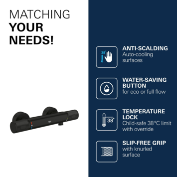 Met GROHE TurboStat technologie blijft de watertemperatuur constant, zonder vervelende schommelingen. De AquaDimmer Eco-functie en EcoButton maken het eenvoudig om de waterstroom aan te passen of te schakelen tussen verschillende uitlopen. De SafeStop-knop is ingesteld op 38 °C voor bescherming tegen verbranding, en met de optionele SafeStop Plus kan de maximale temperatuur tot 43 °C worden begrensd voor extra veiligheid.