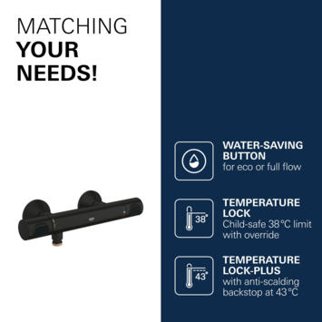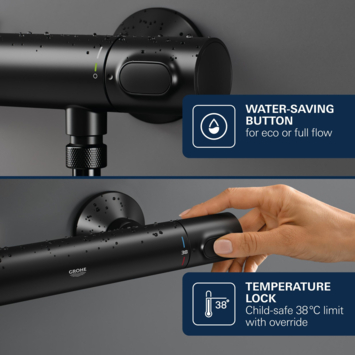 De kraan is standaard voorzien van een waterbesparende instelling, maar met de EcoButton en de waterstroomregelaar kun je eenvoudig een volle waterstraal instellen wanneer gewenst. Voor extra veiligheid is de SafeStop-knop ingesteld op 38 °C, en met de optionele SafeStop Plus kan de maximale temperatuur tot 43 °C worden begrensd. Zo kun je zonder zorgen genieten van je douche.