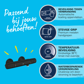 De kraan is voorzien van de GROHE SafeStop knop, die de temperatuur standaard beperkt tot 38°C om verbranding te voorkomen, wat ideaal is voor gezinnen met kinderen. Voor extra bescherming vermindert de automatische veiligheidsuitschakeling de waterstroom als de koudwatertoevoer wegvalt.