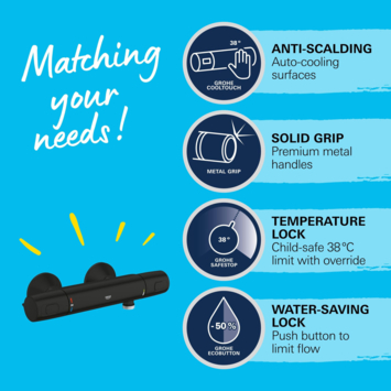 Met GROHE TurboStat geniet je direct van een constante en comfortabele watertemperatuur, terwijl de GROHE CoolTouch technologie voorkomt dat de buitenkant van de kraan te heet wordt. Dit biedt extra veiligheid tijdens het douchen.