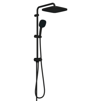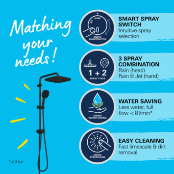 Geniet van een complete douchebeleving met het GROHE Vitalio Comfort 2025 regendouchesysteem met omstelkraan in mat zwart. Dit opbouwsysteem voor wandmontage biedt een royale 25 cm hoofddouche met ontspannende Rain Spray of krachtige SmartRain Spray en een 11 cm handdouche met ShockProof siliconen ring, die zowel een zachte Rain Spray als een krachtige Jet Spray levert.
