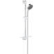 De Grohe Vitalio Comfort doucheset bestaat uit: De Grohe Vitalio Comfort handdouche van 10 centimeter met drie straalsoorten, 175cm Vitalioflex Comfort doucheslang en een glijstang met verstelbare muursteunen en zeepschaal. ij de GROHE Rain O² geven fijne regenstraaltjes het effect van een zomerse regenbui op je lichaam. De GROHE Jet straal is een volle, krachtige straal die de huid tot in de puntjes stimuleert. Bij de GROHE Massage straal zorgen pulserende waterstoten voor een aangenaam tintelende ervaring. Daarnaast zorgt GROHE DreamSpray® technologie voor een perfecte verdeling van het water. GROHE TwistFree voorkomt het meedraaien van de doucheslang waardoor deze niet kan knikken.