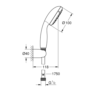 De GROHE Vitalio Start II douchekop bestaat uit een Vitalio Start II handdouche, een Vitalio flex trend doucheslang van 175 centimeter en een wandhouder.