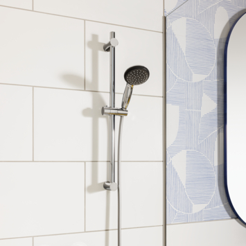 De GROHE Vitalio Start I doucheset best uit: Grohe Vitalio Start I handdouche van 10 centimeter en één stand, 175cm doucheslang met antitwist en een glijstangset met verstelbare muursteunen.