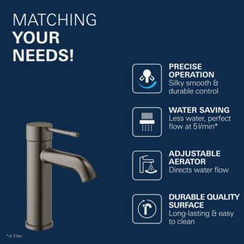 Net als alle Grohe producten zit ook deze Grohe Wastafelkraan Essence New S Grafiet boordevol met Duitse technologie. Met de Grohe SilkMove keramische schijven heb je een precieze controle over de waterstroom. De Grohe EcoJoy functie zorgt ervoor dat de kraan zeer zuinig met water omgaat. Het waterverbruik bevat dan tot 5,7 L per minuut. Het draaibereik van de kraan is zelf in te stellen. Zo kun je hem vast zetten op 0°, 150° of 360° graden. Het QuickFix Plussysteem maakt deze wastafelkraan eenvoudig te installeren en halveert zelfs de tijd die je ervoor nodig hebt. De kraan past perfect in combinatie met overige artikelen uit de Grohe Essence New serie. Mocht grafiet niet jouw favoriete kleur zijn of past het simpelweg totaal niet binnen je huidig badkamerstijl. Geen probleem! Je kunt deze wastafelkraan ook in koper of RVS kopen in de KARWEI webshop. Daarnaast is deze kraan ook in andere maten verkrijgbaar.