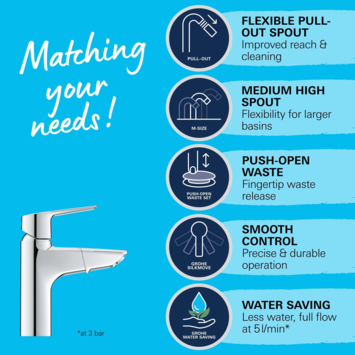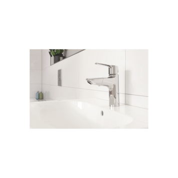 Met de waterbesparende GROHE Start wastafelkraan maak je jouw moderne badkamer helemaal up-to-date. Deze vernieuwde eengreeps wastafelkraan met handige pop-up waste is ontworpen voor een 1-gatsinstallatie en heeft een hogere uitloop, die tevens uittrekbaar is voor extra gebruiksgemak. Het wassen van je haren gaat voortaan moeiteloos onder de kraan en ook de wastafel maak je met de mousseur tot in de puntjes eenvoudig hygiënisch schoon. Na gebruik gaat de uittrekbare mousseur vanzelf weer terug op zijn plaats dankzij het GROHE Magnetic Docking systeem. Superhandig! Binnenin de kraan zorgt de GROHE SilkMove cartouche voor een soepele bediening van de solide metalen hendel, zodat je zonder haperen het watervolume en de temperatuur kunt regelen. Deze innovatieve wastafelmengkraan is bovendien uitgerust met een geïntegreerde temperatuurbegrenzer, waarmee je verbranding door heet water voorkomt én aanzienlijk op je energierekening bespaart. Ook verbruik je veel minder water dankzij de waterbesparende GROHE EcoJoy functie, terwijl je geniet van een comfortabele waterstraal. Via de GROHE Zero gescheiden waterwegen wordt voorkomen dat het water in de kraan in contact komt met lood en nikkel, zodat de wastafelkraan elke dag zuiver en fris drinkwater levert. De vernieuwde GROHE Start wastafelkraan verhoogt het comfort in je badkamer op elk gebied. Ook qua schoonmaakgemak, want dankzij de duurzame en onderhoudsvriendelijke GROHE StarLight chroomafwerking ziet de kraan er zelfs na veelvuldig gebruik onberispelijk uit!