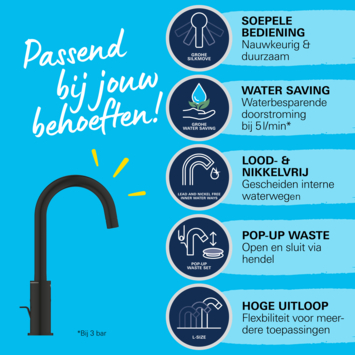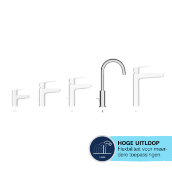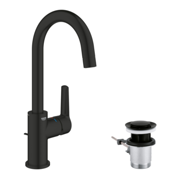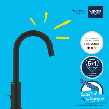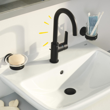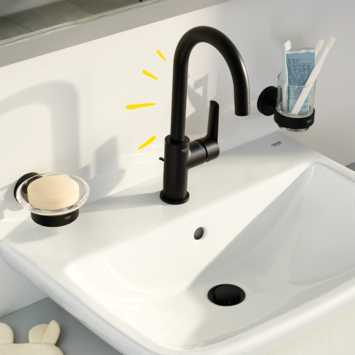 Maak je badkamer compleet met de GROHE Start wastafelmengkraan in Mat Zwart. Deze kraan combineert een modern en stijlvol design met slimme functies, zoals een hoge, draaibare uitloop en een handige pop-up waste voor extra gebruiksgemak. Met de GROHE SilkMove technologie stel je eenvoudig en soepel de gewenste temperatuur en waterhoeveelheid in.