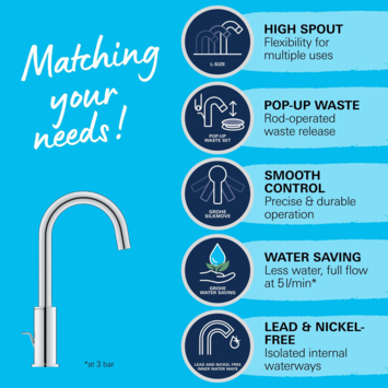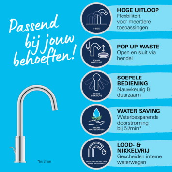 De pop-up waste is eenvoudig te bedienen met een hendel aan de achterkant van de kraan, zodat je handen altijd droog blijven. De hoge, draaibare buisvormige uitloop biedt extra flexibiliteit, waardoor de kraan ideaal is voor verschillende taken. Dankzij de Grohe SilkMove keramische cartouche heb je een langdurige, nauwkeurige controle over het waterdebiet en de temperatuur via de stevige metalen hendel.