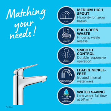 Dankzij de Grohe Zero technologie komt het water nooit in contact met lood of nikkel, wat zorgt voor schoon en veilig water. De kraan is tevens uitgerust met een handige push-open waste, waarmee je de afvoer eenvoudig opent en sluit met een lichte druk.