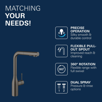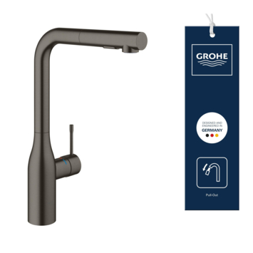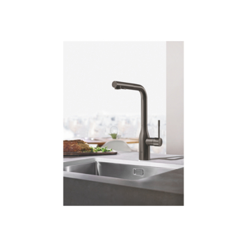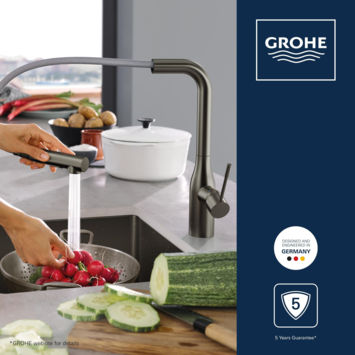 Deze keukenkraan hoort bij de Essence New serie. Die serie bestaat uit een variatie kranen in de kleuren grafiet (Hard Graphite), koper (Warm Sunset) en RVS (SuperSteel). Dankzij de hoge uitloop van deze kraan is het gebruik enorm comfortabel. Ook heeft de kraan een maximaal draaibereik van 360° en een uittrekbare mousseur. Je kunt de kraan daardoor enorm mobiel bewegen. Een pan of emmer vullen wordt zo een stuk eenvoudiger. Na het gebruik van de mousseur glijdt deze zelfstandig terug, dankzij het Grohe EasyDock systeem. Ook is de mousseur handig voor het afspoelen van pannen en met slechts 1 knop wissel je tussen een fijne en krachtige straal. Zo kun je ook de net wat meer hardnekkige restjes te pakken krijgen. Dankzij de Grohe SilkMove keramische schijven heb je relatief eenvoudig de volledige controle over de temperatuur en waterstroom. De Grohe StarLight beschermlaag maakt deze kraan zeer krasbestendig en ook nog eens eenvoudig om te reinigen. Het mooie is dat deze beschermlaag de kwaliteit van de geborstelde RVS buitenlaag niet verbergt. De Grohe Colours Keukenkraan Essence New Grafiet met Uittrekbare Mousseur behoort tot een prachtige serie die staat voor indrukwekkende kwaliteit in een prachtig vormgegeven design. Is grafiet niet helemaal jouw kleur of past het simpelweg niet in de rest van de keuken? Geen probleem! Deze kraan kun je ook in koper of RVS kopen in de KARWEI webshop.