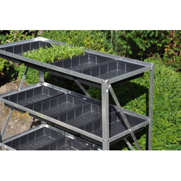 Een compact, blank aluminium rek met 3 kweekniveaus. Het Grow Rack 12 wordt geleverd inclusief 12 sterke zaaibakjes. U bent dus direct klaar om te starten met kweken. Het rek is 99 (l) x 40 (b) x 100 (h) cm. De bakjes zijn 40 x 25 x 5,5 groot en eenvoudig per stuk uitneembaar. De bakjes zijn ook los verkrijgbaar.