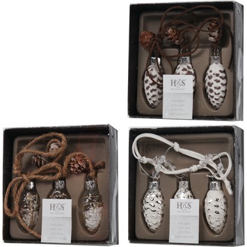 Binnen het kerstthema naturel past deze guirlande met 3 glazen dennenappels perfect. De lengte van deze guirlande is 37 cm en verkrijgbaar in besneeuwd/wit en naturel/bruin.