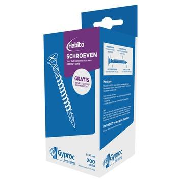 Met de Gyproc HABITO® Schroeven 200 stuks monteert u HABITO® platen op een eenvoudige en snelle wijze tegen een metalen Gyproc frame of houten frame. De Habito schroeven zijn voorzien van een zelfborende, geharde punt, voorboren is dus niet nodig. Om HABITO® Schroeven; altijd op de juiste diepte in te draaien, kunt u gebruik maken van de Gyproc Schroefkop. De HABITO® Schroeven hebben een lengte van 41mm en zijn verpakt in een doosje van 200 stuks. Bij aankoop van 1 doosje HABITO® Schroeven krijgt u 5 bevestigingsschroeven gratis, voor het bevestigen van voorwerpen aan een HABITO® wand.