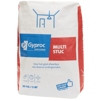 Voor mooi stucwerk op wanden en plafonds gebruik je Gyproc Multi Stuc. De naam zegt het al: met dit gips geef je iedere ondergrond eenvoudig een gladde afwerking om te kunnen verven of behangen. Het product is geschikt voor wanden en plafonds van gipsplaten, metselwerk, beton, kalkzandsteen-, gasbeton- en gipsblokken. Gyproc Multi Stuc wordt hard na ongeveer 45 minuten. Deze zak van 20 kg is voldoende voor ongeveer 5 m2 bij een laagdikte van 2.5 mm.