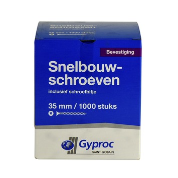 De Gyproc snelbouwschroeven 35 mm zwart 1000 stuks bevestigt je gipskartonplaten op eenvoudige en snelle wijze tegen een metalen skelet. Voorboren is niet nodig. Om Gyproc snelbouwschroeven altijd op de juiste diepte in te draaien, kan je het beste gebruik maken van een Gyproc schroefkop.