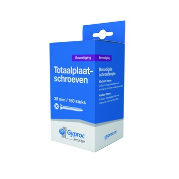 De Gyproc totaalplaatschroeven zijn speciaal ontwikkeld om Gyproc Totaalplaten aan een houten of metalen skelet vast te maken. Ze kunnen direct de Totaalplaat ingedraaid worden zonder voor te boren. De lengte van deze schroeven is 35 mm en de inhoud is 150 stuks.