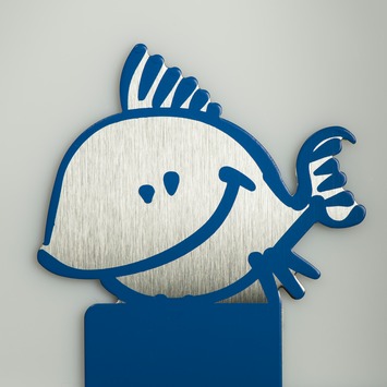 De Kiddy Fish kinderhaak is uitgevoerd in blauw RVS en kan worden bevestigd met de gemonteerde plakstrip.
