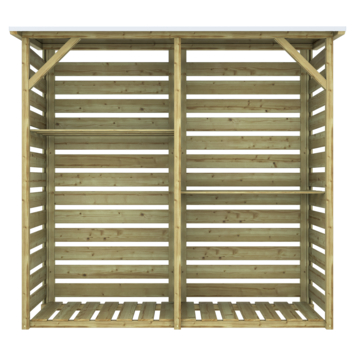 Met de haardhoutberging Twin krijg je een perfecte combinatie van stijl en functionaliteit voor het opbergen van haardhout en andere tuinaccessoires. Deze berging is gemaakt van groen geïmpregneerd grenen, wat niet alleen zorgt voor een moderne uitstraling, maar ook de levensduur tot wel 10 jaar verlengt. De afmetingen van 176 cm hoog, 190 cm breed en 60 cm diep bieden genoeg ruimte voor al je spullen.