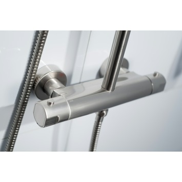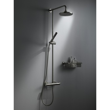 De Haceka Kosmos mat douchekolom regen is handig en prachtig strak vormgegeven. De thermostatische kraan van deze weldadige regendouche is in te stellen van 24 tot 42 graden. De veiligheidspal zorgt ervoor dat de kraan nooit te heet kan worden gedraaid door kinderhandjes. En wat een douchecomfort: de douchekop heeft een doorsnede van maar liefst 20 centimeter en de hoogte is in te stellen van 108 tot 118 centimeter boven de kraan. Bovendien kun je er een losse design handdouche bij nemen met een slang van 150 centimeter. Vind je de Kosmos serie ook zo mooi. Combineer dan alle producten van Kosmos. De Kosmos lijn bestaat uit een collectie kranen, douchecabines, douchesets en alle mogelijke accessoires.