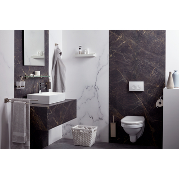 De Haceka Mezzo toiletrolhouder met klep chroom past perfect bij jouw andere Mezzo-accessoires! De toiletrol hangt achter een stijlvolle, symmetrisch vormgegeven klep. Door de slimme uitsparing is deze houder ook zeer geschikt voor dikkere toiletrollen. Vind je de Mezzo serie ook zo mooi, combineer dan alle producten van Mezzo. De Mezzo lijn bestaat uit een collectie kranen, douchesets en alle mogelijke accessoires.