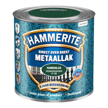 Hammerite Direct over Roest metaallak hamerslag donkergroen 250 ml is een decoratieve, roestwerende metaallak die je zonder primer of grondverf direct over roest kunt aanbrengen. Je hoeft dus niet urenlang te schuren of te ontroesten want Hammerite Hamerslag hecht uitstekend. Het stopt het roestproces en geeft maar liefst 8 jaar roestbescherming. Hammerite Hamerslag is weerbestendig en kan dus goed gebruikt worden om je tuin- of balkonhek weer te laten stralen. Hammerite Hamerslag is in diverse kleuren leverbaar en met het bijzondere hamerslageffect maskeer je eenvoudig allerlei oneffenheden. Kortom; Hammerite Hamerslag biedt bescherming, verfraaiing en bespaart je veel extra werk, tijd en geld.