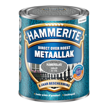 Hammerite Direct over Roest metaallak hamerslag grijs 750 ml is een decoratieve, roestwerende metaallak die je zonder primer of grondverf direct over roest kunt aanbrengen. Je hoeft dus niet urenlang te schuren of te ontroesten want de Hammerite metaallak hecht uitstekend. Het stopt het roestproces en geeft maar liefst 8 jaar roestbescherming. Hammerite Direct over Roest metaallak hamerslag is weerbestendig en kan dus goed gebruikt worden om je tuin- of balkonhek weer te laten stralen. De Hammerite hamerslag is in diverse kleuren leverbaar en met het bijzondere hamerslageffect maskeer je eenvoudig allerlei oneffenheden. Kortom; Hammerite Hamerslag biedt bescherming, verfraaiing en bespaart je veel extra werk, tijd en geld.