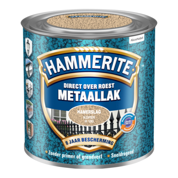 Hammerite Direct over Roest metaallak hamerslag koper 250 ml is een decoratieve, roestwerende metaallak die je zonder primer of grondverf direct over roest kunt aanbrengen. Je hoeft dus niet urenlang te schuren of te ontroesten want Hammerite Hamerslag hecht uitstekend. Het stopt het roestproces en geeft maar liefst 8 jaar roestbescherming. Hammerite Hamerslag is weerbestendig en kan dus goed gebruikt worden om je tuin- of balkonhek weer te laten stralen. Hammerite Hamerslag is in diverse kleuren leverbaar en met het bijzondere hamerslageffect maskeer je eenvoudig allerlei oneffenheden. Kortom; Hammerite Hamerslag biedt bescherming, verfraaiing en bespaart je veel extra werk, tijd en geld.