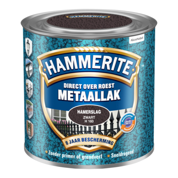Hammerite Direct over Roest metaallak hamerslag zwart 250 ml is een decoratieve, roestwerende metaallak die je zonder primer of grondverf direct over roest kunt aanbrengen. Je hoeft dus niet urenlang te schuren of te ontroesten want Hammerite Hamerslag hecht uitstekend. Het stopt het roestproces en geeft maar liefst 8 jaar roestbescherming. Hammerite Hamerslag is weerbestendig en kan dus goed gebruikt worden om je tuin- of balkonhek weer te laten stralen. Hammerite Hamerslag is in diverse kleuren leverbaar en met het bijzondere hamerslageffect maskeer je eenvoudig allerlei oneffenheden. Kortom; Hammerite Hamerslag biedt bescherming, verfraaiing en bespaart je veel extra werk, tijd en geld.