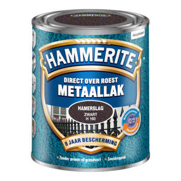 Hammerite Direct over Roest metaallak hamerslag zwart 750 ml is een decoratieve, roestwerende metaallak die je zonder primer of grondverf direct over roest kunt aanbrengen. Je hoeft dus niet urenlang te schuren of te ontroesten want de Hammerite metaallak hecht uitstekend. Het stopt het roestproces en geeft maar liefst 8 jaar roestbescherming. Hammerite Direct over Roest metaallak hamerslag is weerbestendig en kan dus goed gebruikt worden om je tuin- of balkonhek weer te laten stralen. De Hammerite hamerslag is in diverse kleuren leverbaar en met het bijzondere hamerslageffect maskeer je eenvoudig allerlei oneffenheden. Kortom; Hammerite Hamerslag biedt bescherming, verfraaiing en bespaart je veel extra werk, tijd en geld.