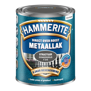 Hammerite Direct over Roest metaallak structuur donkergrijs 750 ml is een decoratieve, roestwerende metaallak met structuureffect voor alle soorten (roestig en beschadigd) metaal. Je kunt het zonder primer of grondverf direct over roest aanbrengen. Je hoeft dus niet urenlang te schuren of te ontroesten, want Hammerite structuurlak hecht uitstekend. Het stopt het roestproces en geeft maar liefst 8 jaar roestbescherming. Hammerite structuurlak is weerbestendig en extra sterk waardoor je het goed kunt gebruiken voor de bescherming van allerlei metalen objecten buiten. Hammerite structuurlak is in diverse kleuren leverbaar.