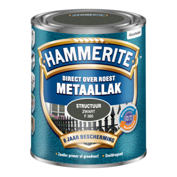 Hammerite Direct over Roest metaallak structuur zwart 750 ml is een decoratieve, roestwerende metaallak met structuureffect voor alle soorten (roestig en beschadigd) metaal. Je kunt het zonder primer of grondverf direct over roest aanbrengen. Je hoeft dus niet urenlang te schuren of te ontroesten, want Hammerite structuurlak hecht uitstekend. Het stopt het roestproces en geeft maar liefst 8 jaar roestbescherming. Hammerite structuurlak is weerbestendig en extra sterk waardoor je het goed kunt gebruiken voor de bescherming van allerlei metalen objecten buiten. Hammerite structuurlak is in diverse kleuren leverbaar.