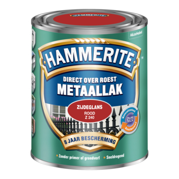 Hammerite Direct over Roest metaallak zijdeglans rood 750 ml is een decoratieve, roestwerende metaallak voor alle soorten (roestig en beschadigd) metaal. Je kunt het zonder primer of grondverf direct over roest aanbrengen. Je hoeft dus niet urenlang te schuren of te ontroesten want Hammerite metaallak hecht uitstekend. Het stopt het roestproces en geeft maar liefst 8 jaar roestbescherming. Hammerite metaallak is waterafstotend en weerbestendig waardoor je het goed kunt gebruiken worden voor de bescherming van allerlei metalen objecten buiten. Hammerite metaallak is in diverse kleuren leverbaar en is UV-bestendig waardoor het metaal langdurig verfraait.