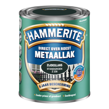 Hammerite Direct over Roest metaallak zijdeglans standgroen 750 ml is een decoratieve, roestwerende metaallak voor alle soorten (roestig en beschadigd) metaal. Je kunt het zonder primer of grondverf direct over roest aanbrengen. Je hoeft dus niet urenlang te schuren of te ontroesten want Hammerite metaallak hecht uitstekend. Het stopt het roestproces en geeft maar liefst 8 jaar roestbescherming. Hammerite metaallak is waterafstotend en weerbestendig waardoor je het goed kunt gebruiken worden voor de bescherming van allerlei metalen objecten buiten. Hammerite metaallak is in diverse kleuren leverbaar en is UV-bestendig waardoor het metaal langdurig verfraait.