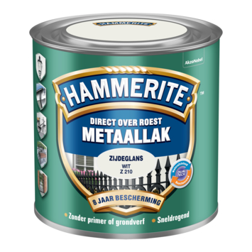 Hammerite Direct over Roest metaallak zijdeglans wit 250 ml is een decoratieve, roestwerende metaallak voor alle soorten (roestig en beschadigd) metaal. Je kunt het zonder primer of grondverf direct over roest aanbrengen. Je hoeft dus niet urenlang te schuren of te ontroesten want Hammerite metaallak hecht uitstekend. Het stopt het roestproces en geeft maar liefst 8 jaar roestbescherming. Hammerite metaallak is waterafstotend en weerbestendig waardoor je het goed kunt gebruiken worden voor de bescherming van allerlei metalen objecten buiten. Hammerite metaallak is in diverse kleuren leverbaar en is UV-bestendig waardoor het metaal langdurig verfraait.