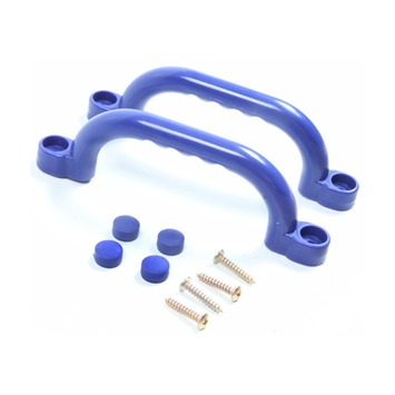 De handgreepset blauw bevat twee universeel toepasbare handgrepen voor het monteren van bijvoorbeeld een klimrek of speeltoestel. De handgrepen hebben een lengte van 18 centimeter (exclusief montagevoeten) en zijn van kunststof gemaakt. De bijbehorende schroeven en afdekkapjes zijn meegeleverd.